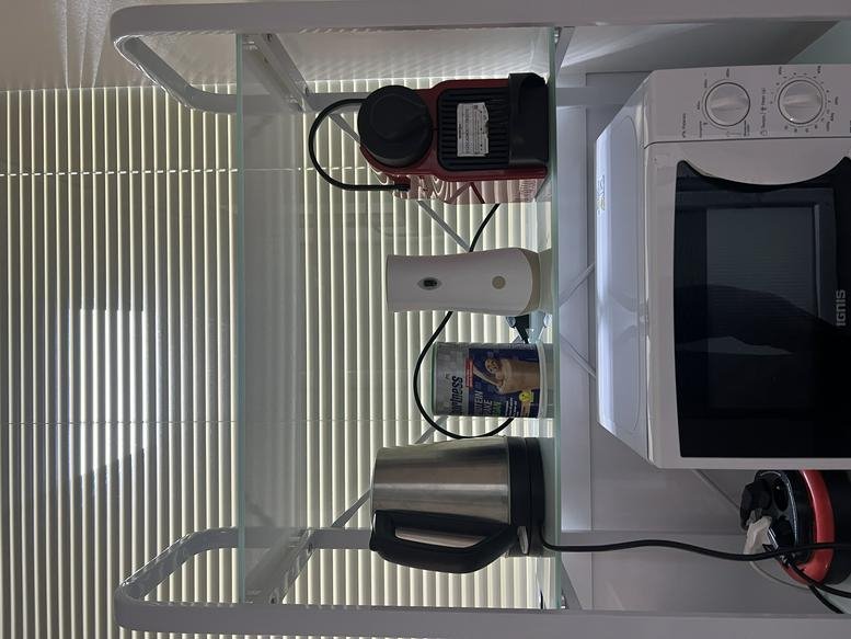 The building features two on-site cafés, including Café 44, with snack spots like Charlie Food and Café Snack Itry nearby. The property includes parking and is within 300 metres of banks, laundry services, and a bakery. Food delivery via Glovo is also available.